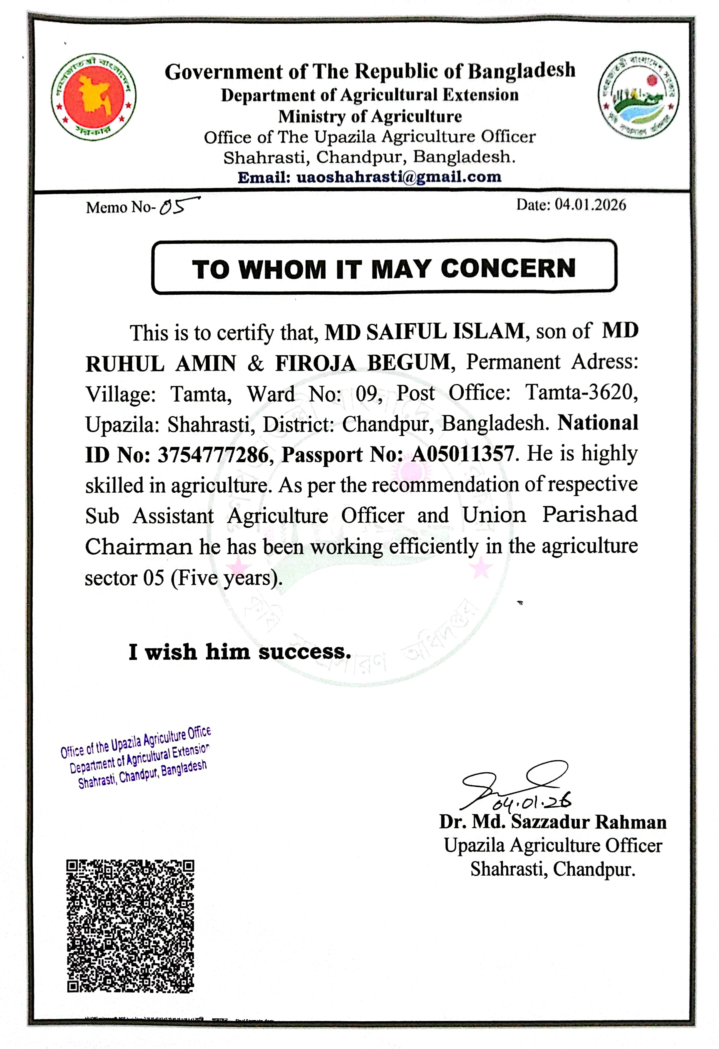 | ৪ | মো. সাইফুল ইসলাম এর অভিজ্ঞতা সনদ | | ০৫-০১-২০২৬ | দেখুন | |