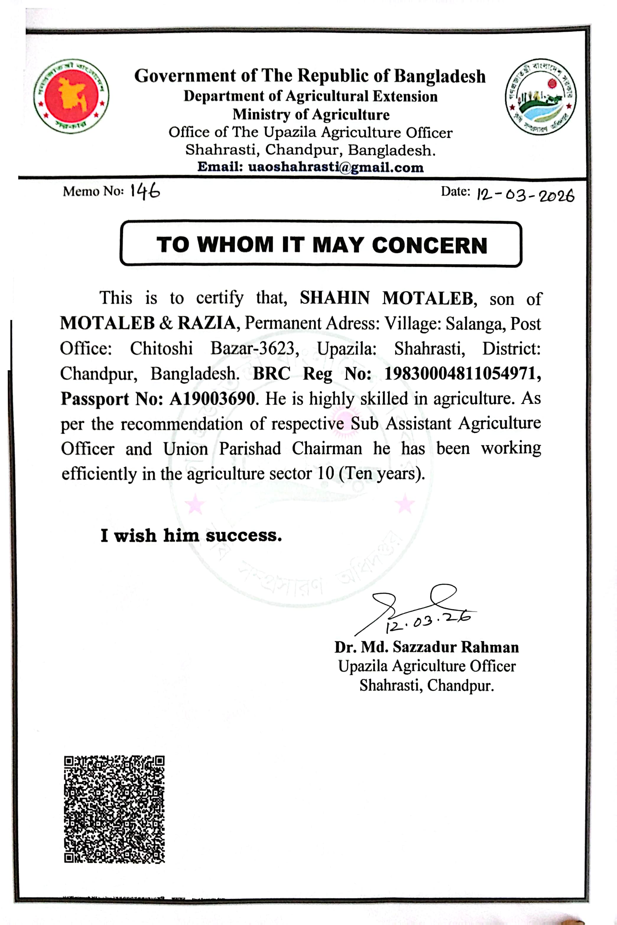 | ২ | শাহিন মোতালেবের কৃষি বিষয়ক অভিজ্ঞতা সনদ | | ১৭-০৩-২০২৬ | দেখুন | |