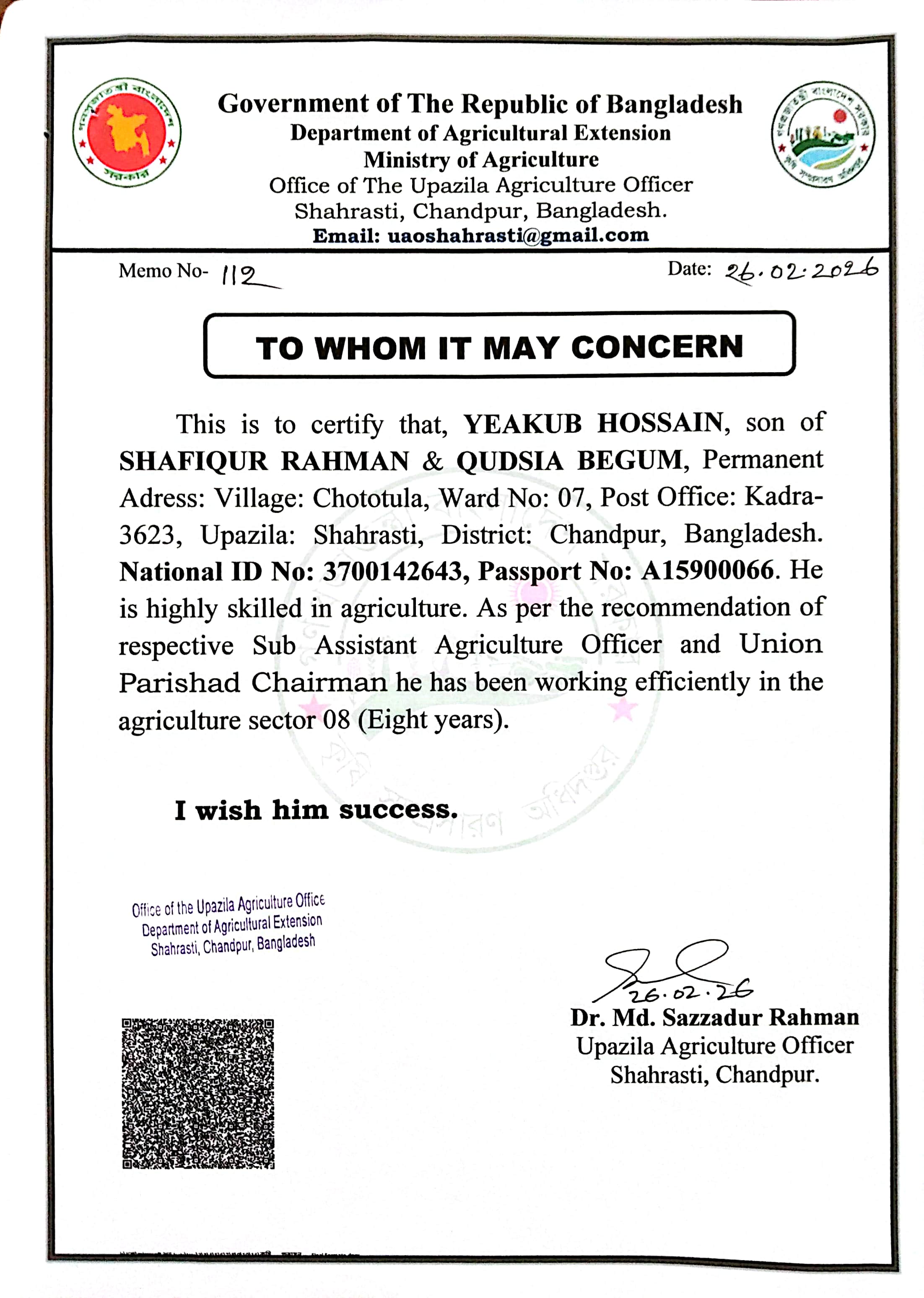 | ১ | ইয়াকুব হোসেনের কৃষি বিষয়ক অভিজ্ঞতার সনদ | | ১৭-০৩-২০২৬ | দেখুন | |