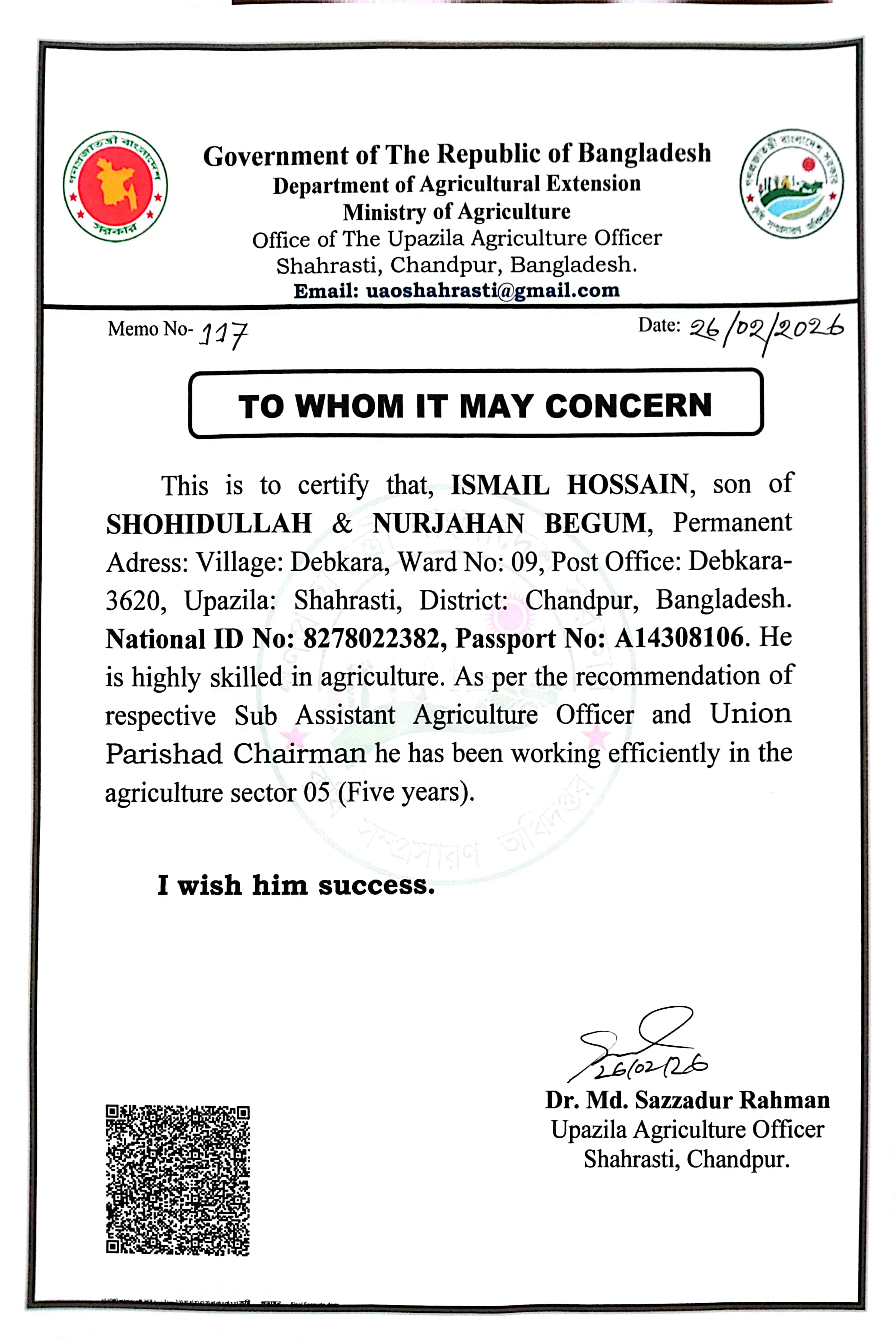 | ৩ | ইসমাইল হোসেনের কৃষি বিষয়ক অভিজ্ঞতা সনদ | | ১৭-০৩-২০২৬ | দেখুন | |